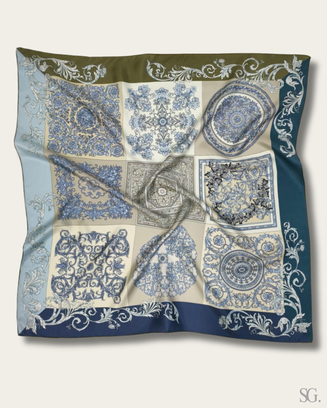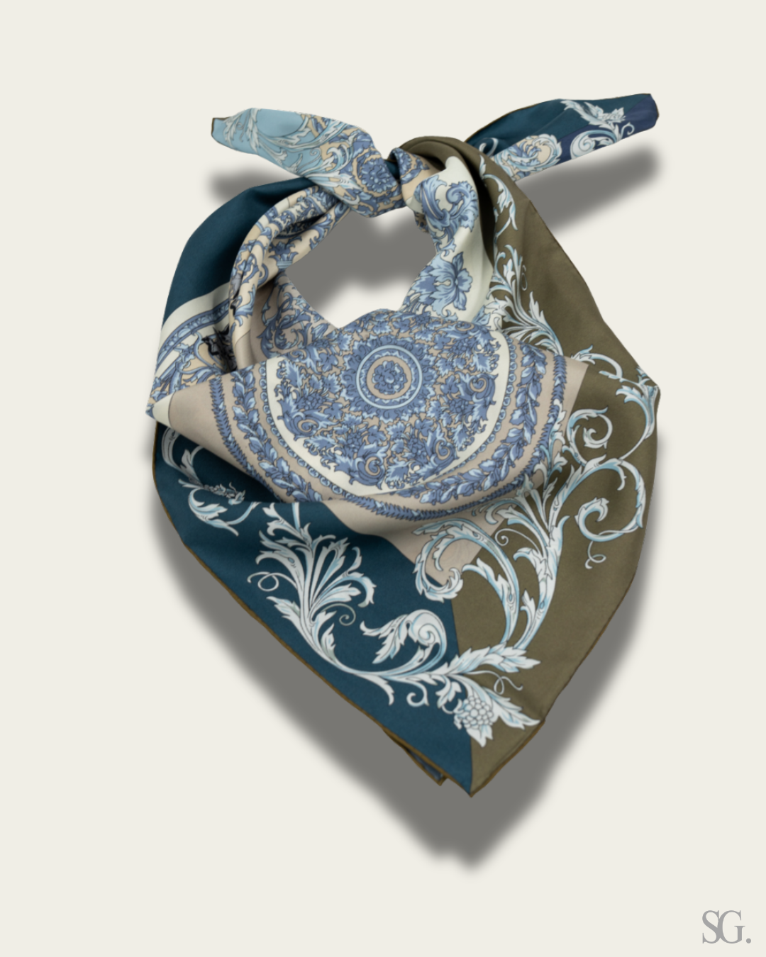 Maxime, en scarf i 100% mulbärs siden. Chic känsla med blå och beiga toner tillsammans med mörkgröna och marinblåa detaljer. Storleken på 85x85 cm ger oändliga möjligheter – bär den som en topp, runt halsen, som håraccessoar eller knuten på väskan för en chic finish året om.